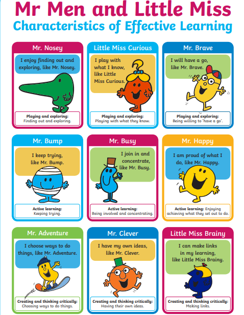 Every Friday in EYFS we have a celebration gathering where we give out certificates based on the charactistics of effective learning linked with Mr/Mrs Men Characters.